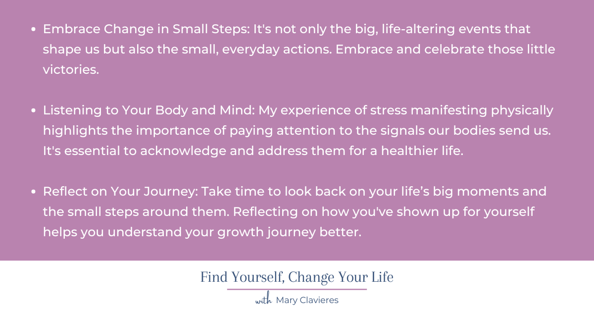 I mentioned at the beginning that there can be big changes and also small changes that you make. In this episode, I'm going to talk about a few of those big changes, those big life changing moments, and how they impacted me as a way that led me to finding myself again.